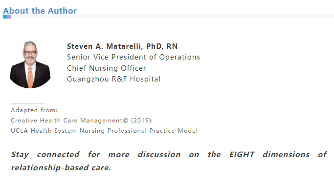 To have a greater understanding of relationship-based care, our nursing team will be undergoing classroom and clinical training related to the EIGHT dimensions of the relationship-based care model developed by Creative Healthcare Management™.
